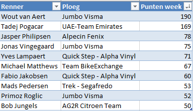 Toch nog even een korte terugblik naar afgelopen week. De onderstaande 10 renners hebben de meeste punten binnengehaald in de eerste week.
