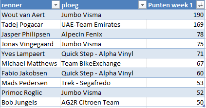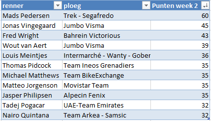 In week 2 staan er in het Tourspel andere renners in de top 10 dan in week 1. Er zijn per renner echter wel veel minder punten binnengehaald dan in de eerste week. In deze tweede week (van 6 dagen) had je kunnen scoren met: