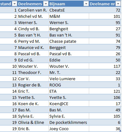 We gaan nog een laatste spannende week tegemoet, maar het is altijd leuk om te kijken wat de huidige standen van alle klassementen (geel, groen, bolletjes, wit en het ploegenklassement) zouden betekenen als de Tour nu afgelopen zou zijn. Dat geeft een beeld van wat er allemaal nog mogelijk is. Om niet teveel prijs te geven, laten we alleen de top 20 zien en doen we dit zonder de punten, zo willen we de spanning tot het einde behouden. De verschillen zijn in ieder geval heel klein, en een kleine verschuiving in de klassementen kan grote gevolgen hebben voor de einduitslag. Ook blijft het nog de vraag of iedereen de Tour uit zal rijden. Een uitvaller kan nog flinke gevolgen hebben!