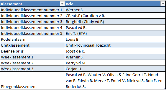 Dit was superspannend tot op het laatste moment. Door de winst van Philipsen van vandaag, wordt Werner S. met twee punten verschil de winnaar van het individueel klassement!! Gefeliciteerd! CbeatsE (Carolien van R.) eindigt als tweede. Berghgeit (Cindy vd. B) is derde geworden. Pascal vd B. is op de vierde plek geëindigd en Eric T. (ETA) als vijfde.