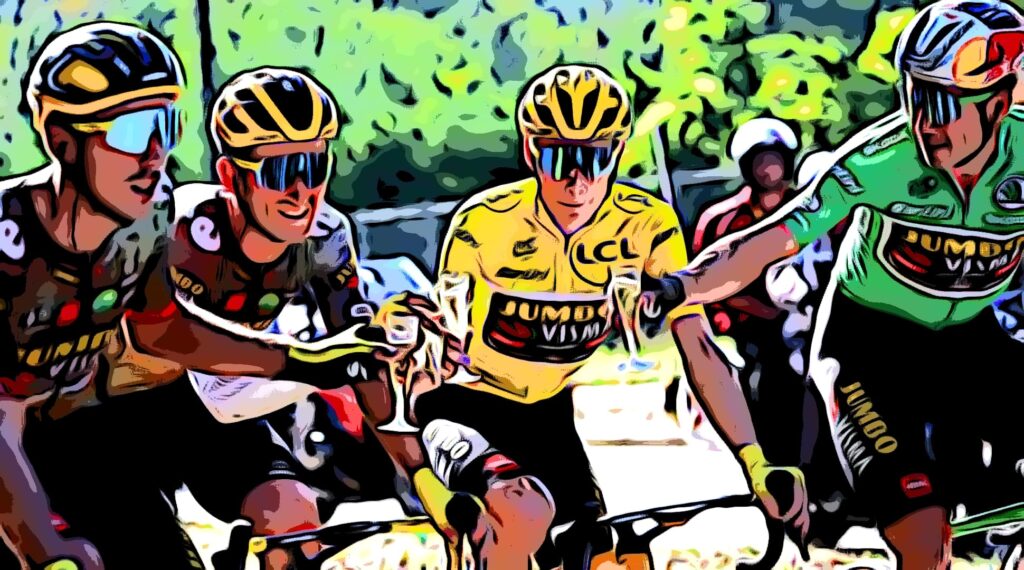 De Jumbo-Vismaploeg maakte van de laatste etappe een feestje. Wout van Aert demarreerde vanaf de start uit het peloton. Vingegaard en Tadej Pogacar haalden hem lachend weer bij en het trio fietste rustig verder totdat ze weer bijgehaald werden door het peloton.