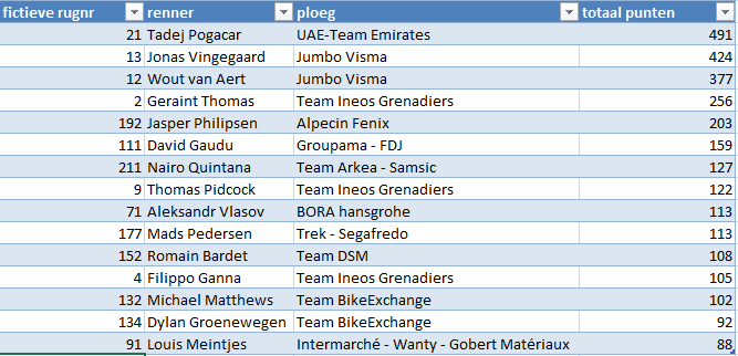 Onderstaande team met Tadej Pogacar als kopman had je 3371 punten kunnen opleveren. Werner S. zat daar met 2865 punten niet eens zo gek ver vandaan. Pogacar is voor het derde jaar op rij degene met de meeste punten in het tourspel (2020: 462 punten, 2021: 473 punten en 2022: 491 punten) en is daarmee al 3 jaar de ideale kopman. Wout van Aert maakt een stijgende lijn door (2020: 171 punten, 2021: 230 punten en 2022: 377 punten). Dit alles is natuurlijk geen enkele garantie voor volgend jaar.
