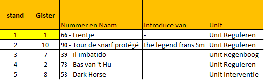 - 1 t/m 5 van het individuele klassement