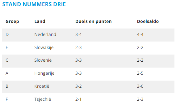 Morgen staan de wedstrijden Slowakije – Oekraïne, Polen – Oostenrijk en Nederland – Frankrijk op het programma. De stand wordt morgen ook pas na de laatste wedstrijd bijgewerkt (rond 23:30 uur).